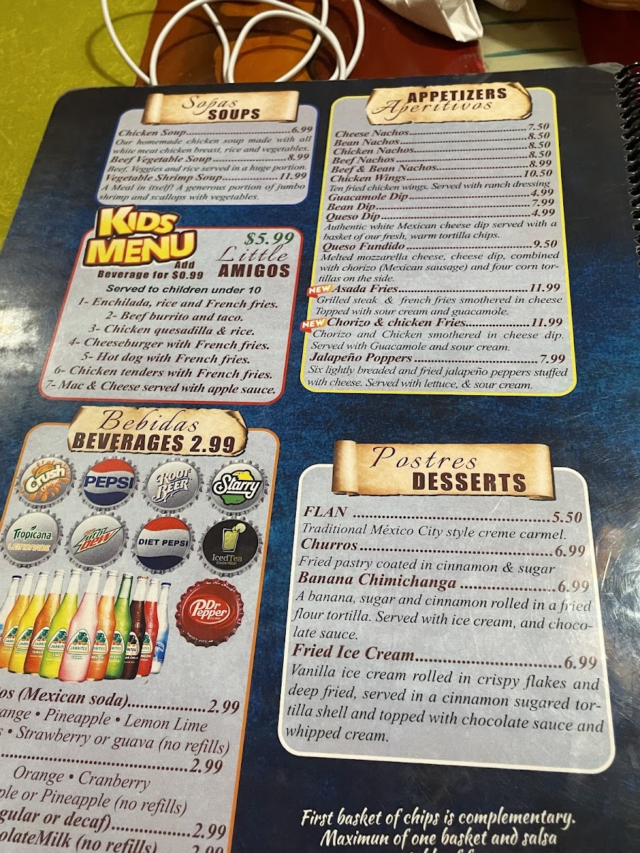 The menu flows smoothly from soups and salads to main courses and finishes with traditional desserts such as flan and churros. Warm beverages and cold drinks complement the meals, rounding out an easygoing dining occasion that feels both satisfying and genuine.